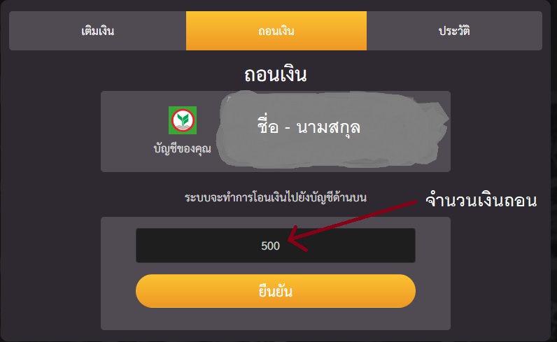 การถอนเงิน ให้ คลิก ถอนเงิน และใส่ยอดที่จะถอนเงิน พร้อมกดยืนยัน ชื่อและเลขบัญชีต้องตรงกับที่สมัครครั้งแรก หากการทำธุระกรรมของท่านรอนานเกิน 5 นาที โปรดติดต่อแอดมิน @gzaslot
